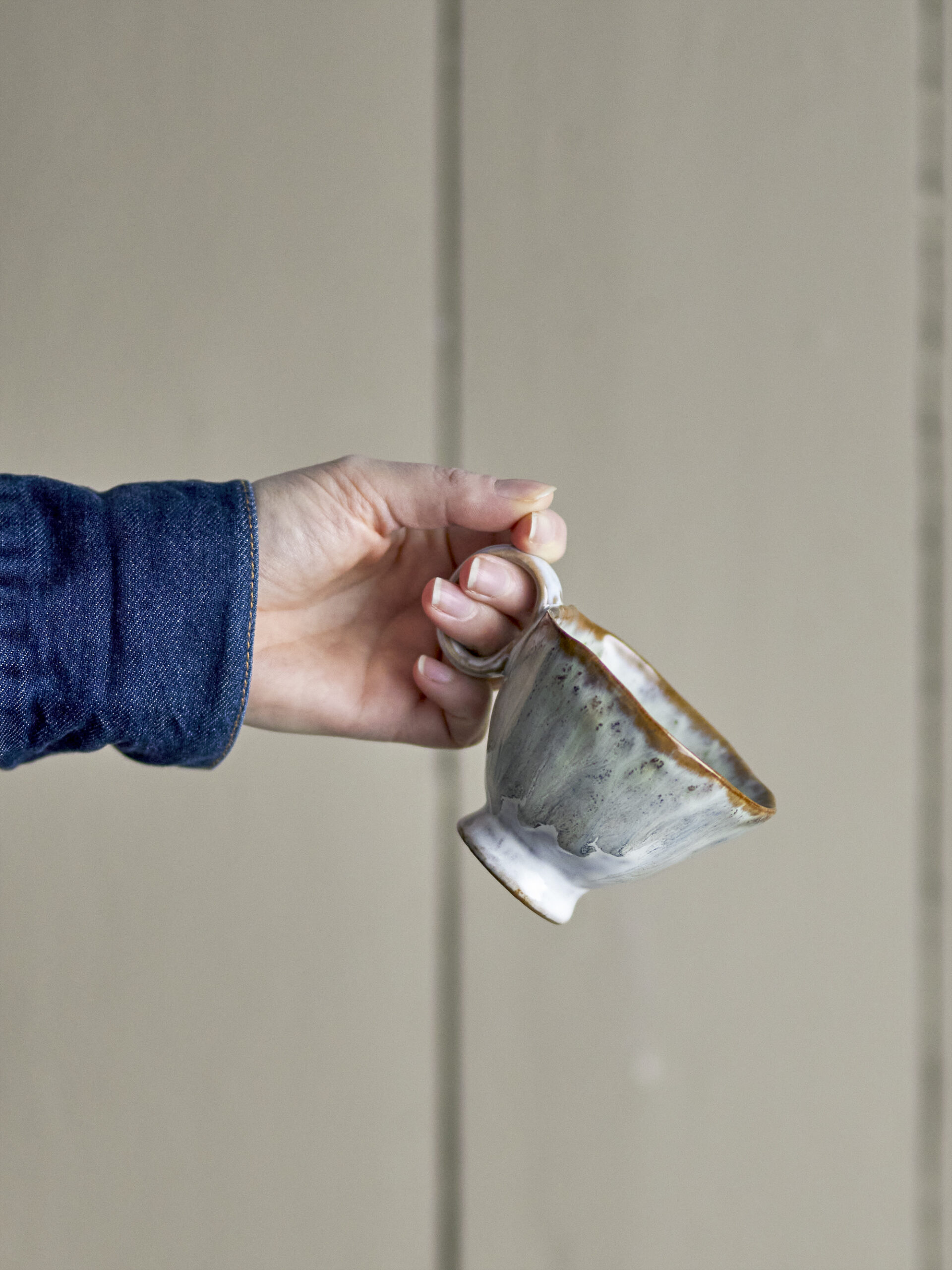 „Bloomingville“ „Imogen“ puodelis yra rankų darbo, lengvo ir spalvingo dizaino. Padengtas pilkšvai žalių atspalvių reaktyvia glazūra, šis puodelis sukuria harmoningą spalvų paletę, kuri papildo jo unikalią formą. Rankų darbo aspektas ir reaktyvi glazūra užtikrina, kad kiekvienas puodelis būtų unikalus.