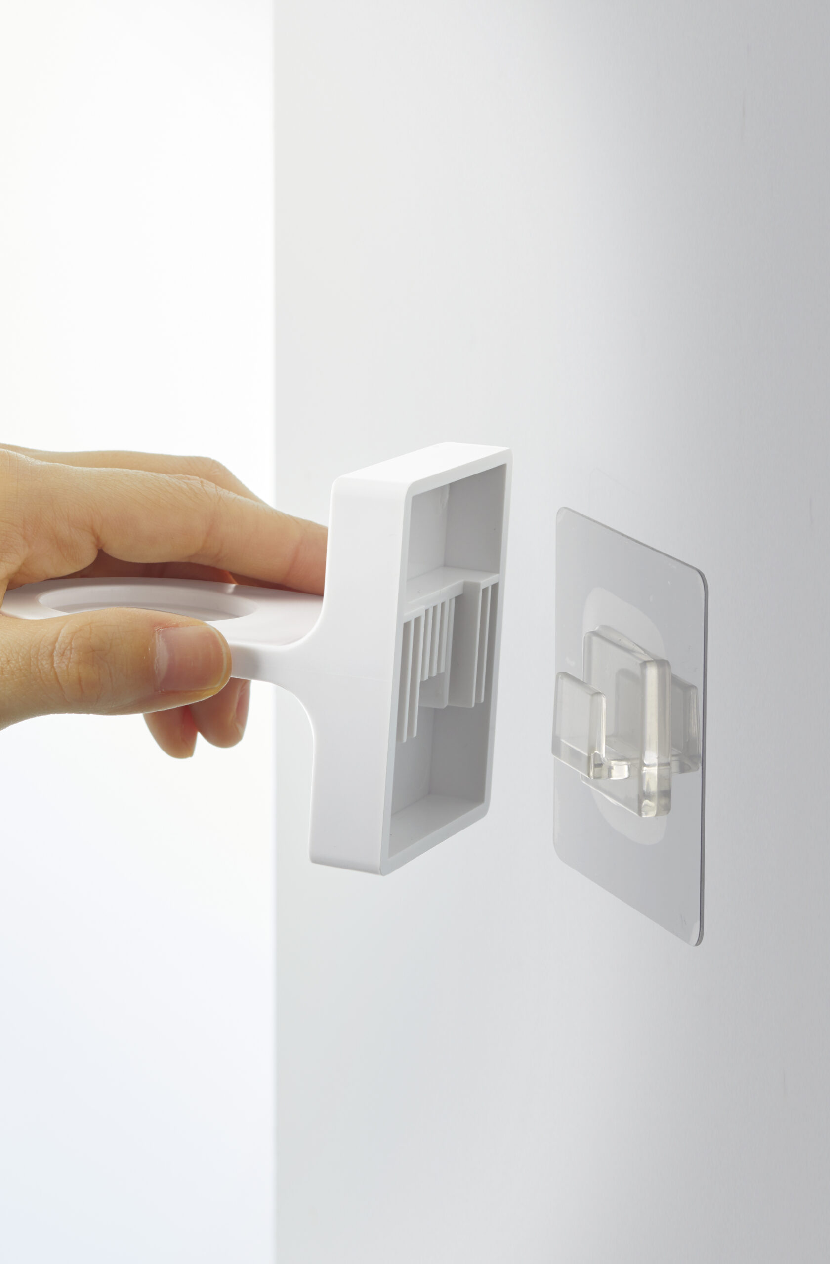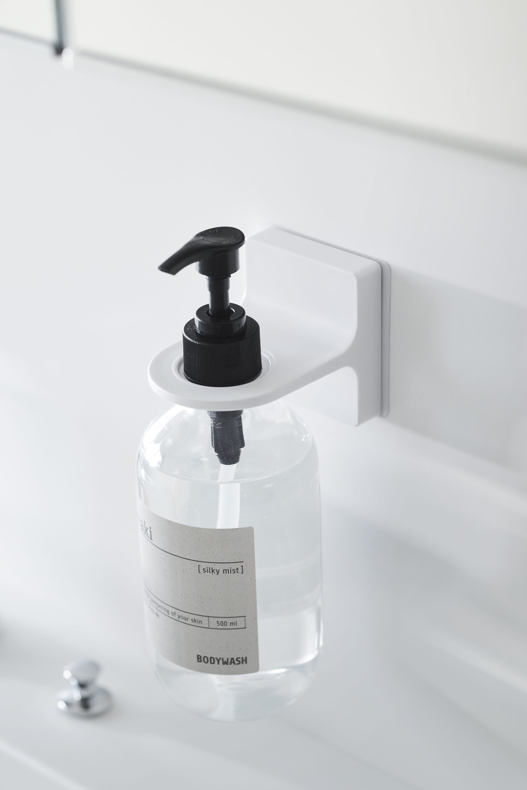 Šis laikiklis lengvai tvirtinamas prie sienos priklijuojant plėvelę su kabliuku, užtikrinančiu tvirtą ir saugų laikymą. Jis tvarkingai laiko muilo, prausiklio ar šampūno dozatorių ir padeda palaikyti švarią bei tvarkingą erdvę aplink praustuvą, vonią ar duše.